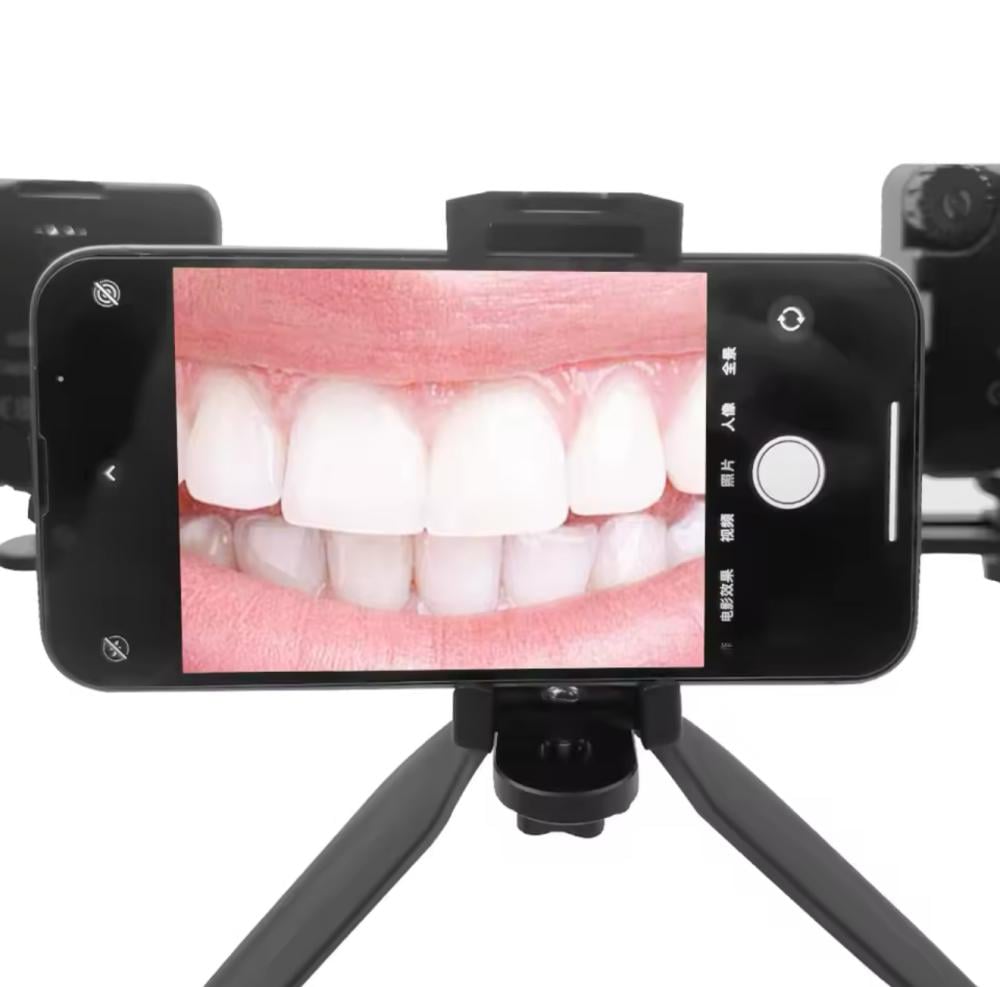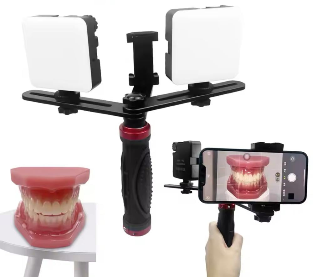 معظم اطباء الاسنان ليس لديهم كاميرا احترافية للتصوير وذلك لإرتفاع سعرها ،ولكن معظمهم يملك جواله الخاص ،فتم توفير جهاز حامل الجوال مع الاضاءات لتسمح لك بتصوير جميع حالات الاسنان سواءً بالصور او الفيديو